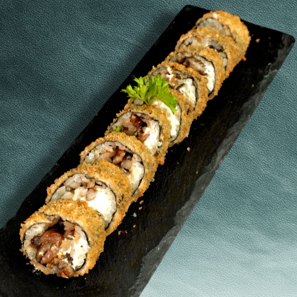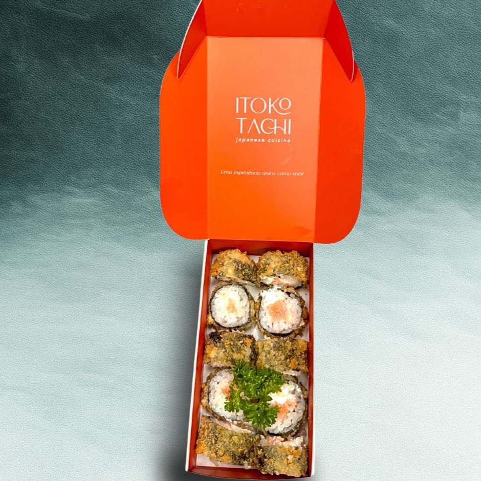 Alga Nori, Arroz Japonês, Salmão, Cream Cheese e Cebolinha, empanado e frito, uma explosão de sabores e texturas. 10 Unidades