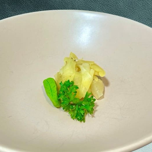 Niguiri com arroz japonês e lâmina de tilápia, finalizado com togarashi, trazendo uma leve picância e textura única. 5 Unidades