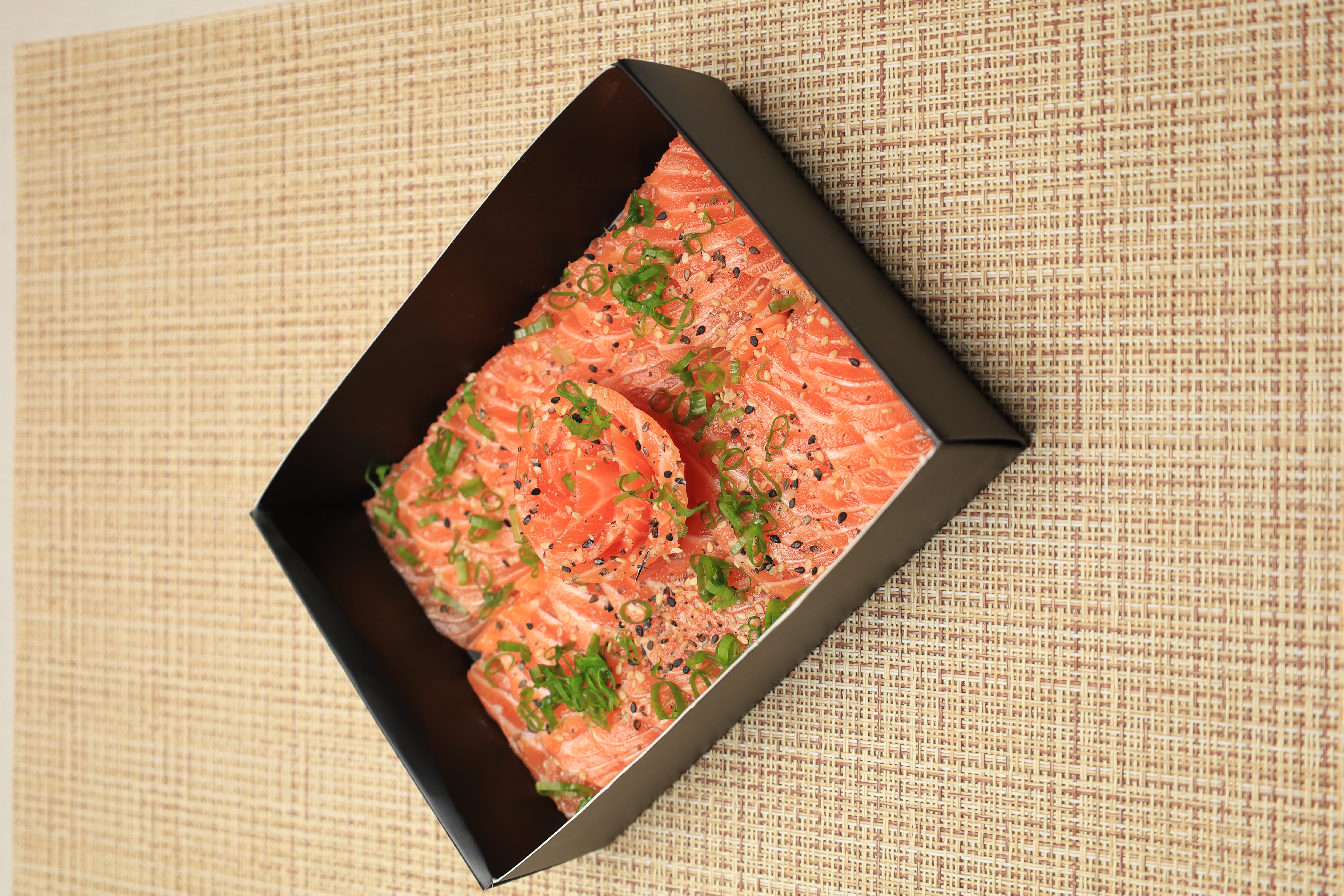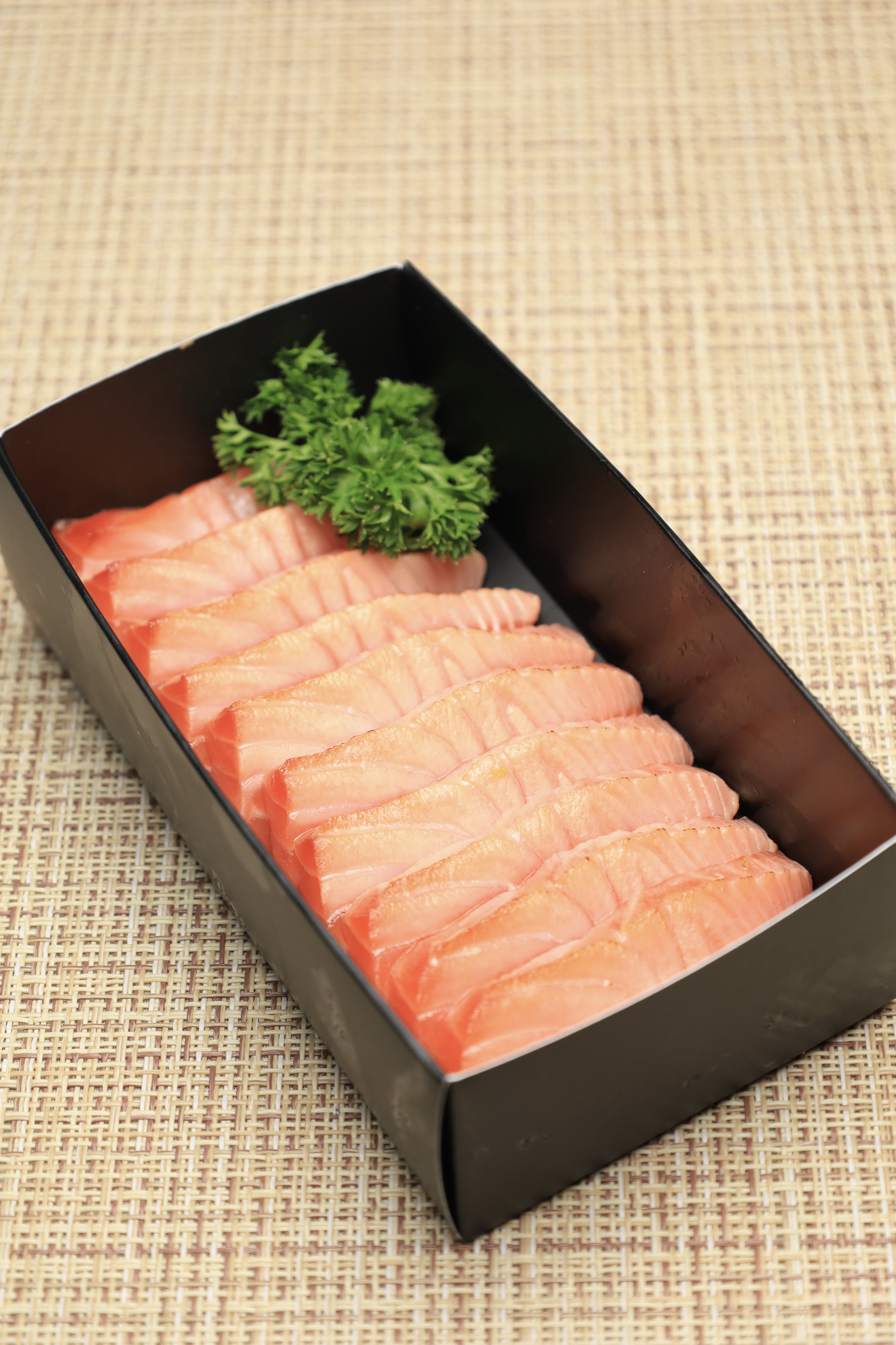 10 peças de Sashimi de Salmão, levemente grelhadas na superfície, mantendo o interior macio e suculento, com um aroma irresistível.
