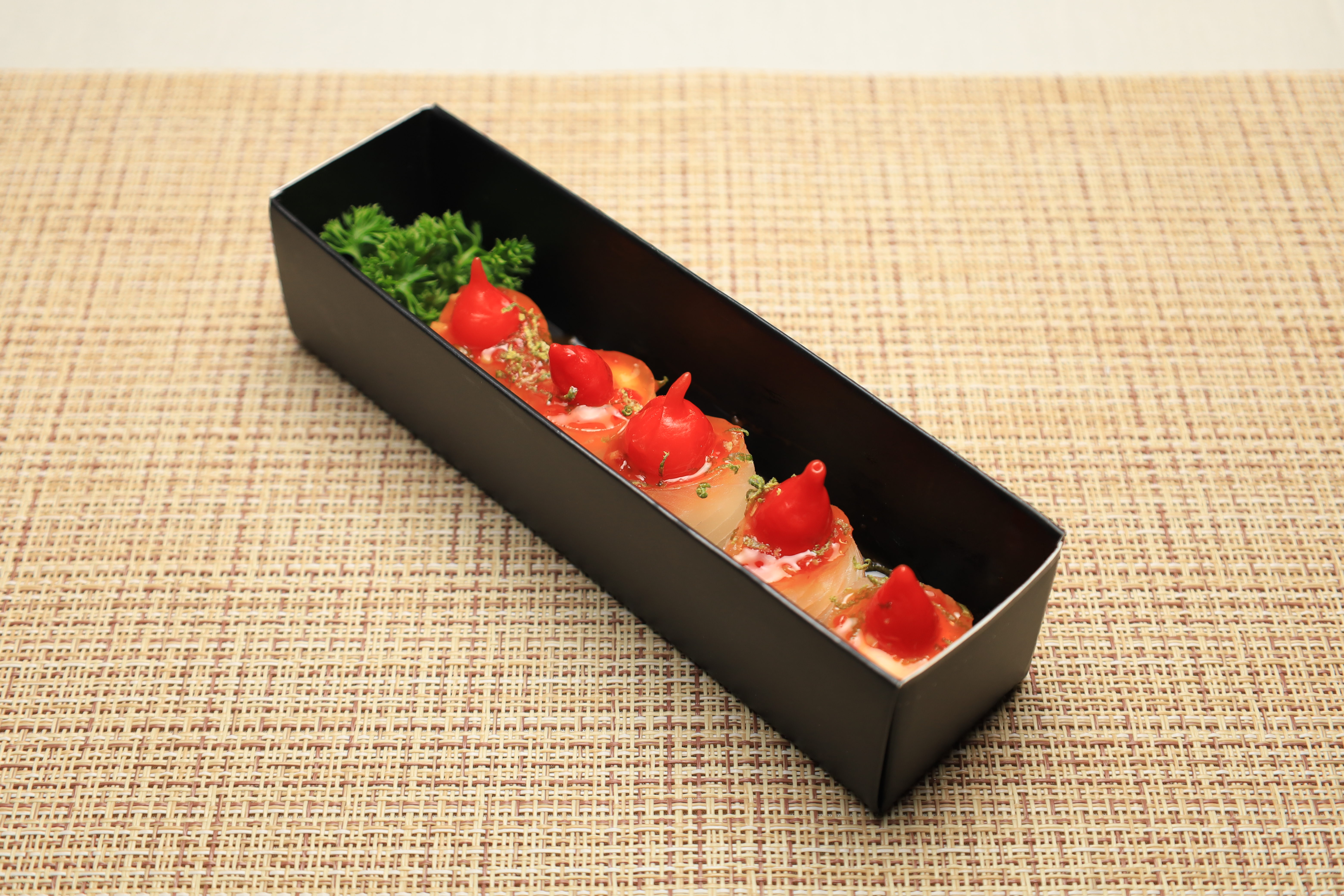 5 peças do delicioso Tai gunkan. Uma fina fatia de tilápia, recheada com cream cheese, pimenta biquinho, tai de pimenta (geleia) e um toque de raspa de limão.