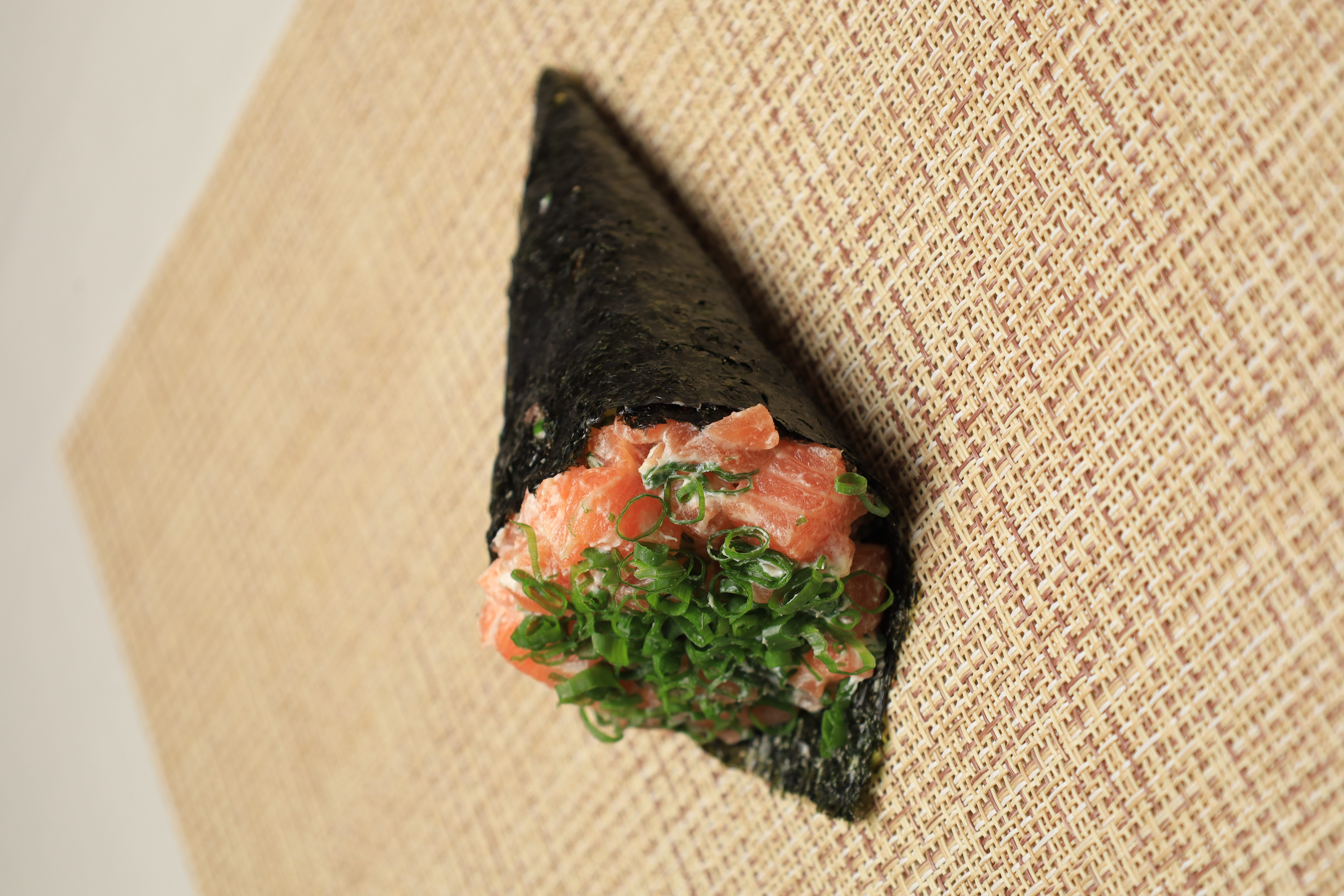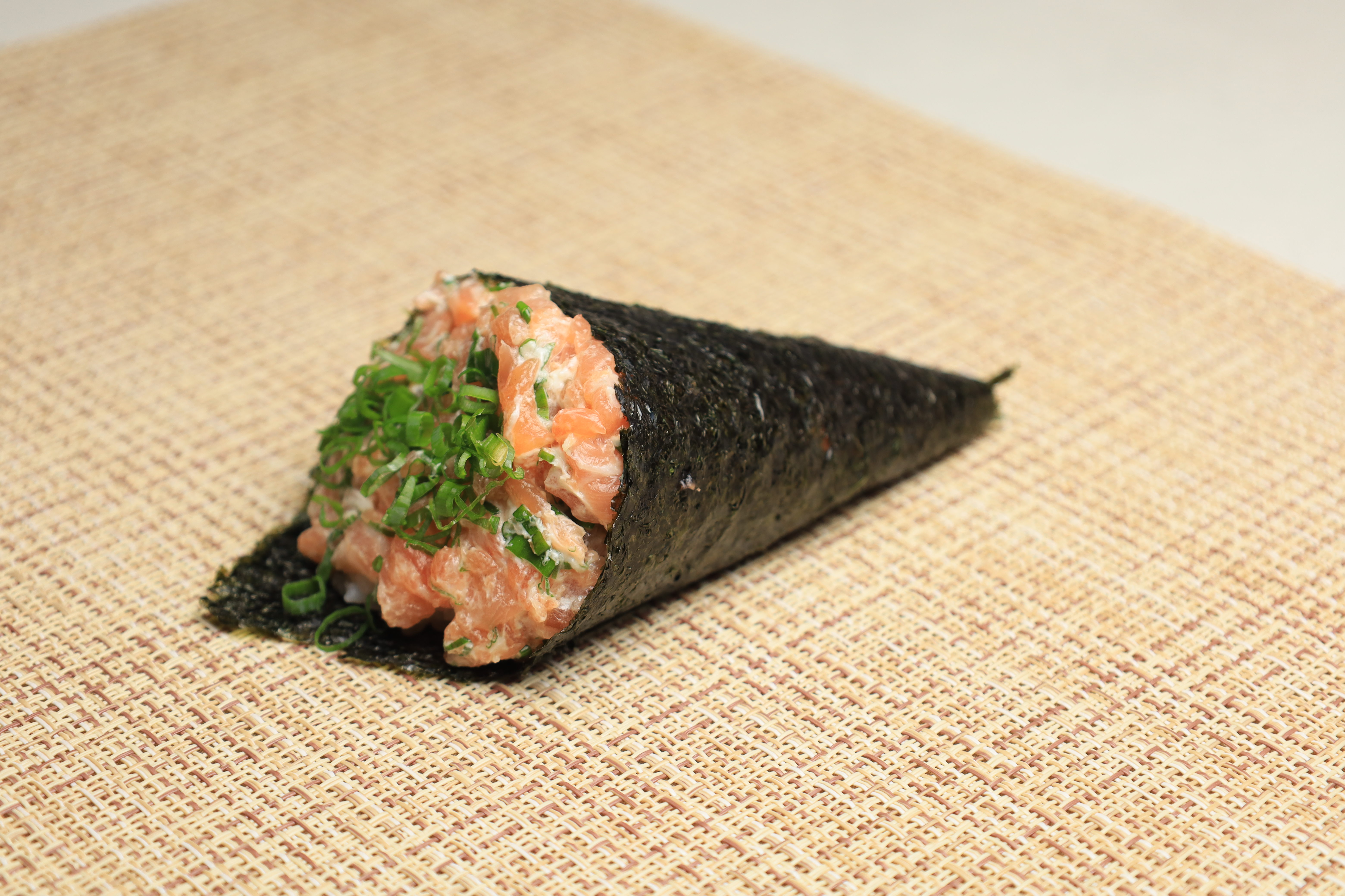 Um temaki generoso com patê de salmão fresco, cream cheese cremoso e cebolinha, tudo envolto em alga nori crocante e arroz japonês. Frescor e sabor equilibrados em cada mordida. Aproximadamente: 150g