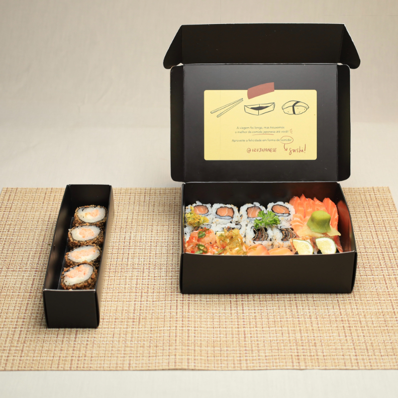 5 Sashimis de Salmão; 2 Niguiris Skin; 2 Niguiris de Salmão; 2 Gunkans (Nin Niku Eby e Remon Joy); 4 Uramakis Skin; 4 Uramakis de Salmão; 5 Hot Philadelphia com Crispy de Couve (servidos à parte)