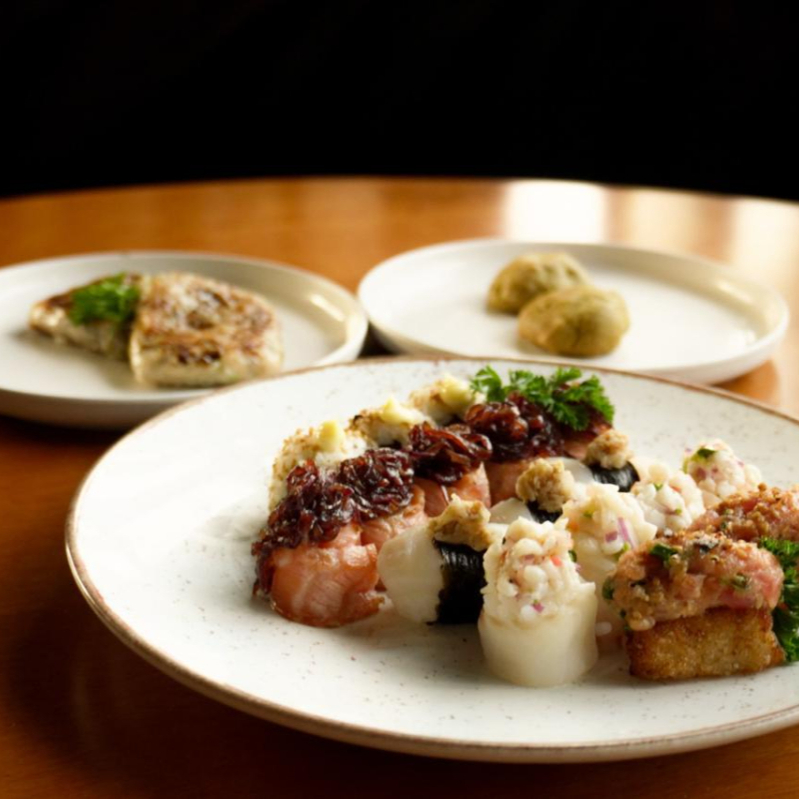Composto por 2 und dumpling de porco e camarão, 3 und uramaki de salmão com kimchi, 5 und joy eby cramell, 3 und nigiri de vieira, 4 und joy de vieira, 2 und spicy tuna gohan, 2 und cookies de matcha com pistache.
