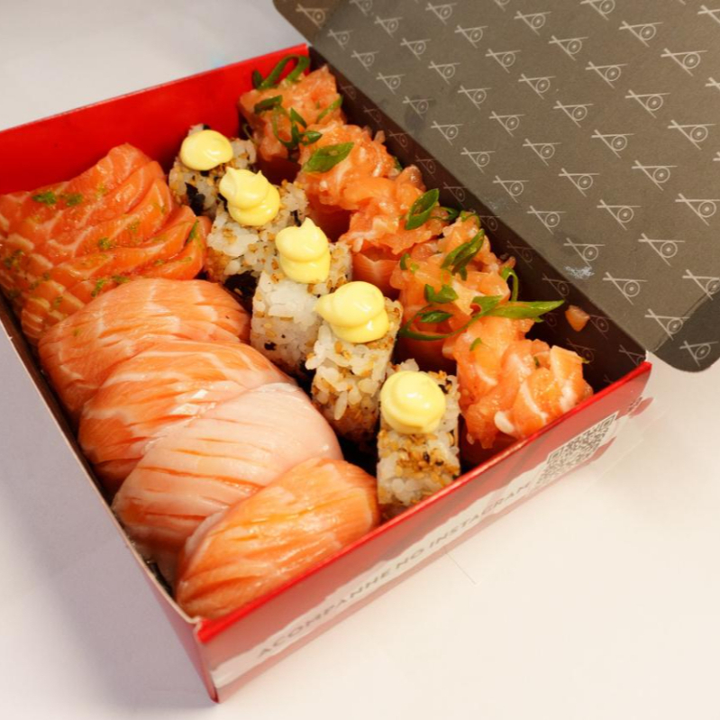 Composto por 5 und joy de salmão, 5 und uramaki de salmão, 5 und de sashimi de salmão trufado, 4 und nigiri de salmão trufado.
