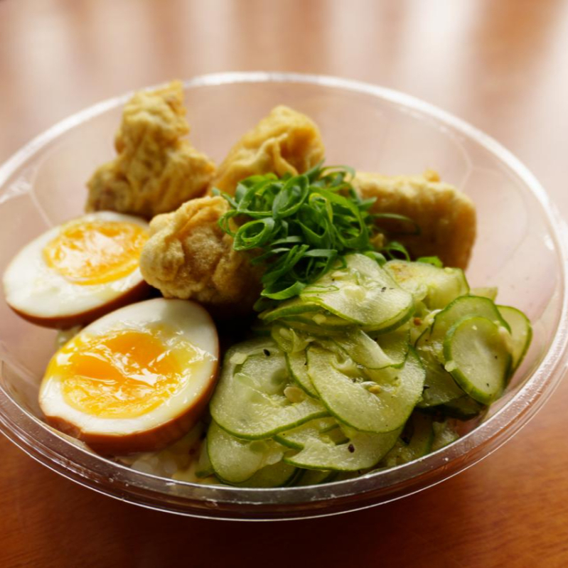 Composto por arroz japonês, tempurá de sobrecoxa, ovo marinado, salada de pepino cítrico, maionese kewpie, furikake, finalizados com cebolinha.