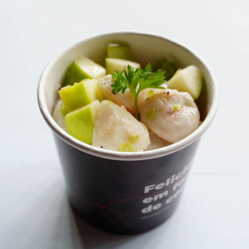Composto por vieira, maçã verde, cebola roxa, pimenta de cheiro, pimenta dedo de moça, caldo de limão, sal marinho, finalizado com pimenta do reino.
