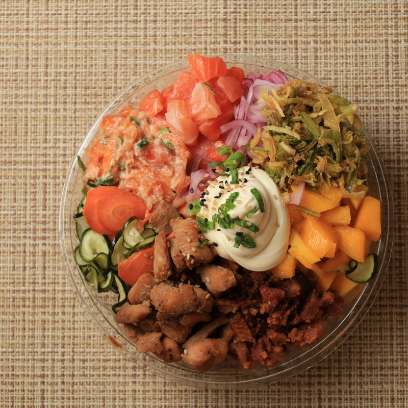 Receita autoral com a assinatura do Chef Rafael. Arroz Japonês (150g) - Salmão em cubos (50g) - Frango teriyaki (50g) - Patê de salmão (50g) - Crisp de bacon (25g) - Cream Cheese (25g) - Sunomono (50g) - Manga (25g) - Cebola Roxa (25g) - Crisp de alho poró (25g) - Cebolinha a Gosto - Gergelim Torrado a Gosto Uma verdadeira obra-prima em forma de poke. Aproximadamente 500g