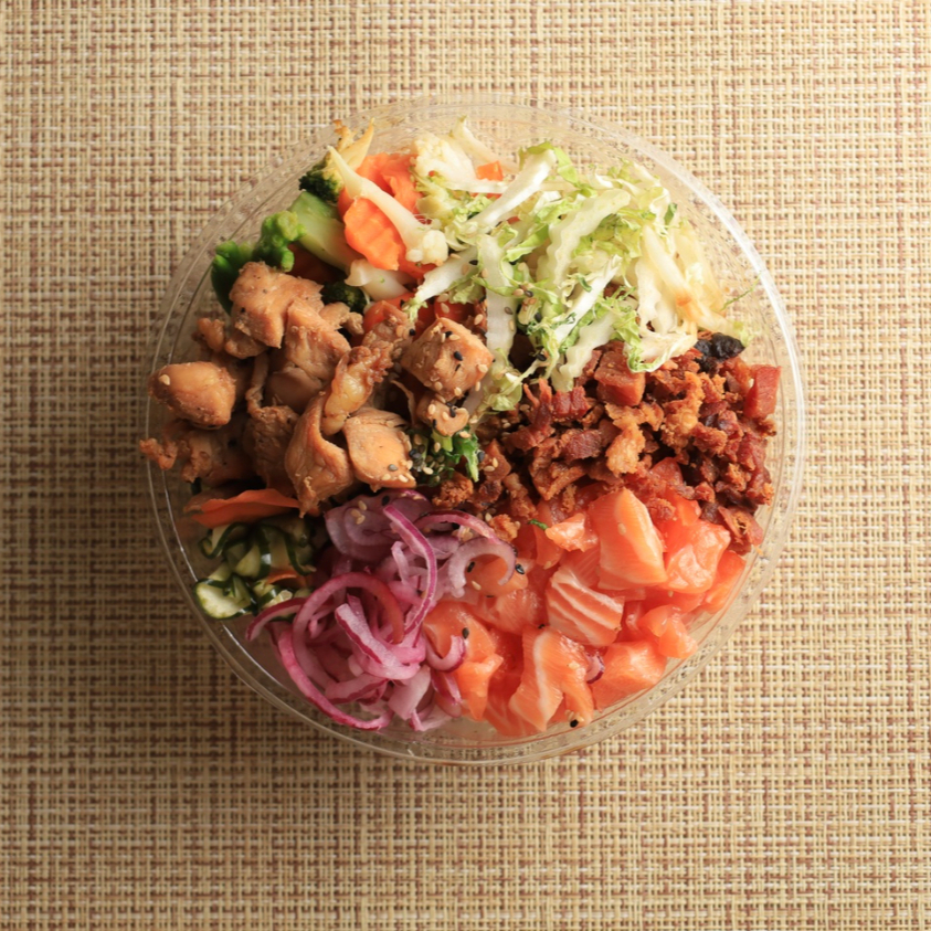 O melhor dos dois mundos em um só Poke! - Arroz Japonês (150g) - Frango Teriyaki (50g) -Salmão (50g) - Acelga (25g) - Cebola Roxa (25g) - Sunomono (50g) - Mix de verduras (50g) - Crispy de bacon (50g) - Cebolinha A Gosto - Gergelim Torrado A Gosto -Aproximadamente 500g
