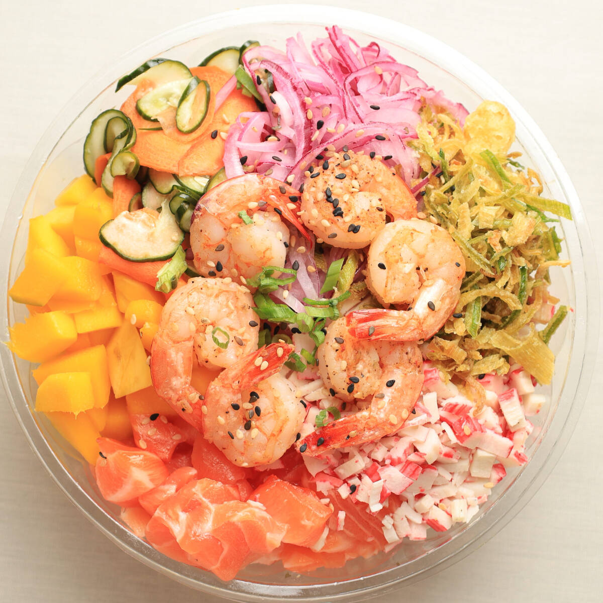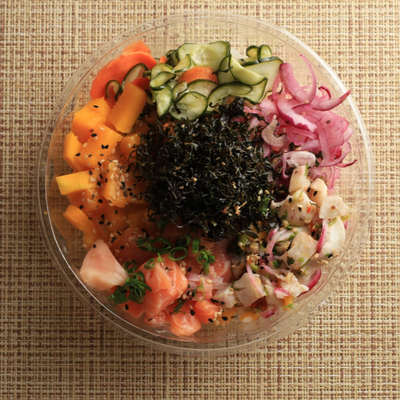A experiência completa para amantes de poke! Base de arroz japonês (150g), camarão ao alho e óleo (50g), salmão fresco (50g), sunomono (50g), cebola roxa (25g), manga (50g), kani (50g) e crispy de alho-poró (25g). Finalizado com cebolinha e gergelim torrado a gosto. Aproximadamente 500g