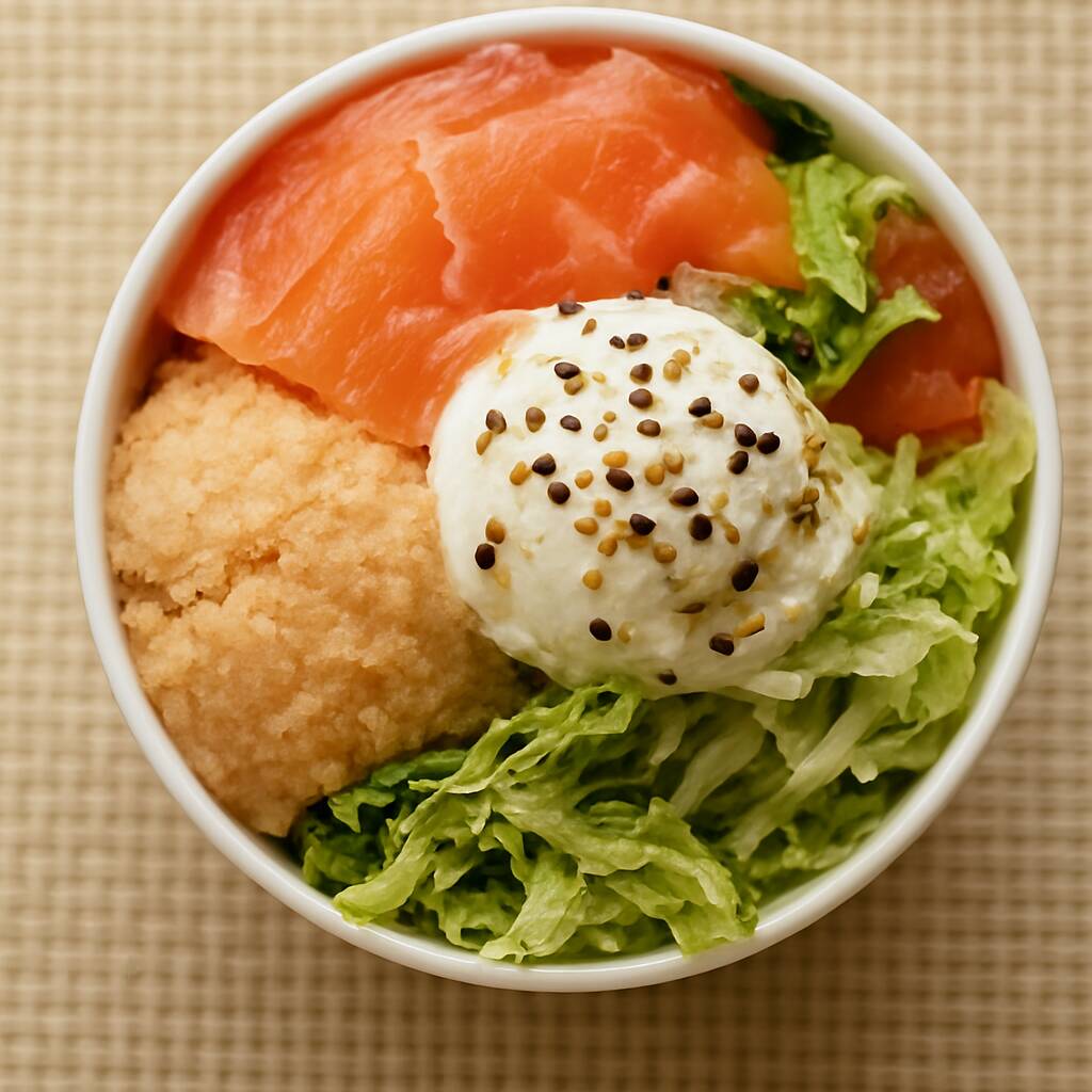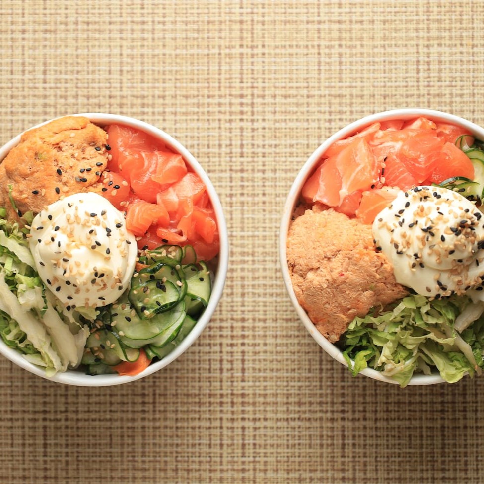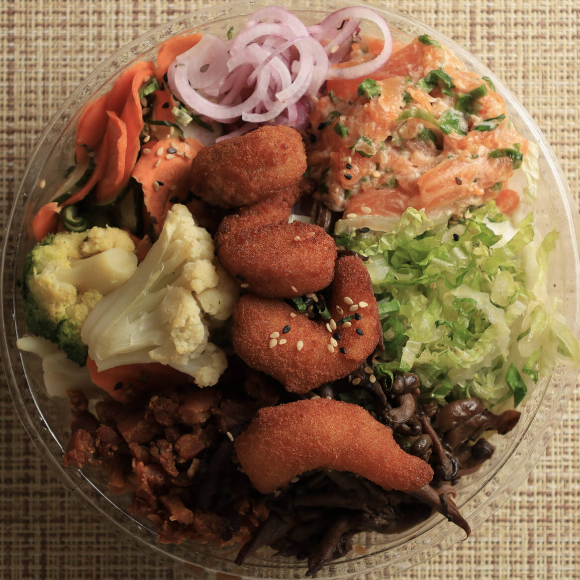 Uma combinação equilibrada e cheia de sabor! Base de arroz japonês (150g), camarão empanado (50g), patê de salmão (50g), sunomono (50g), shimeji (50g), cebola roxa (25g), mix de verduras (50g) e acelga (25g). Finalizado com bacon crocante, cebolinha e gergelim torrado a gosto. Aproximadamente: 500g