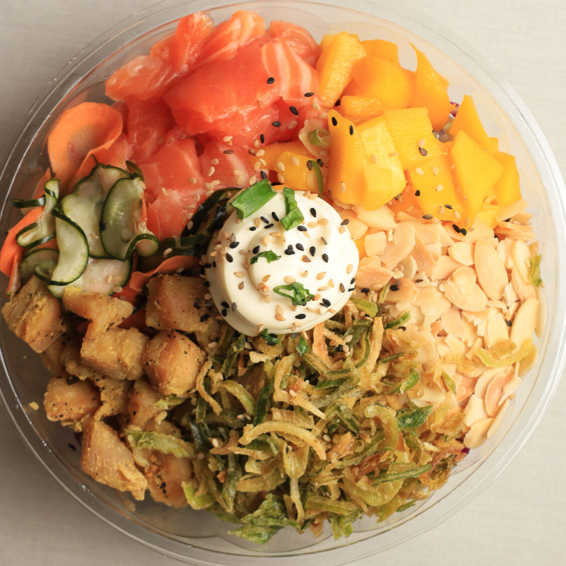 Leve, refrescante e nutritivo.Mix de folhas (150g) - Frango Lemon Pepper (50g) - Salmão (50g) - Sunomono (50g) - Cream Cheese (25g) - Mix De Verduras (50g) - Manga (50g) - Amêndoas (25g) - Crisp de alho poró (15g) - Cebolinha a Gosto - Gergelim Torrado a Gosto - Aproximadamente 500g