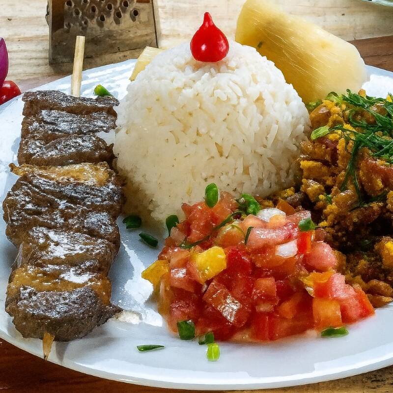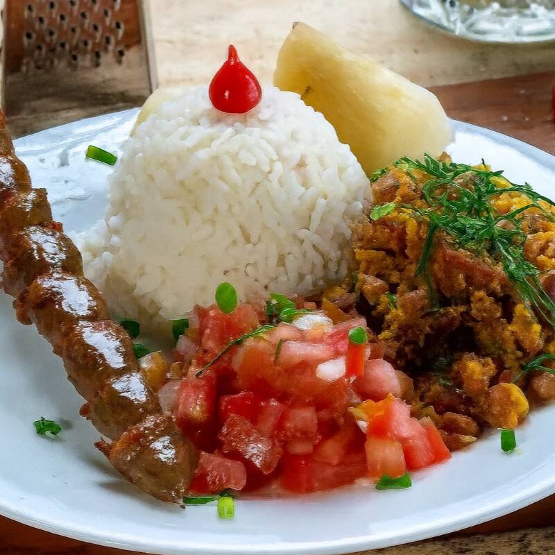 Espetinho de coração servido com arroz branco soltinho, feijão tropeiro, mandioca cozida na manteiga e vinagrete de tomates frescos.