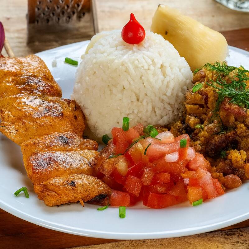 Espetinho de frango com bacon servido com arroz branco soltinho, feijão tropeiro, mandioca cozida na manteiga e vinagrete de tomates frescos.