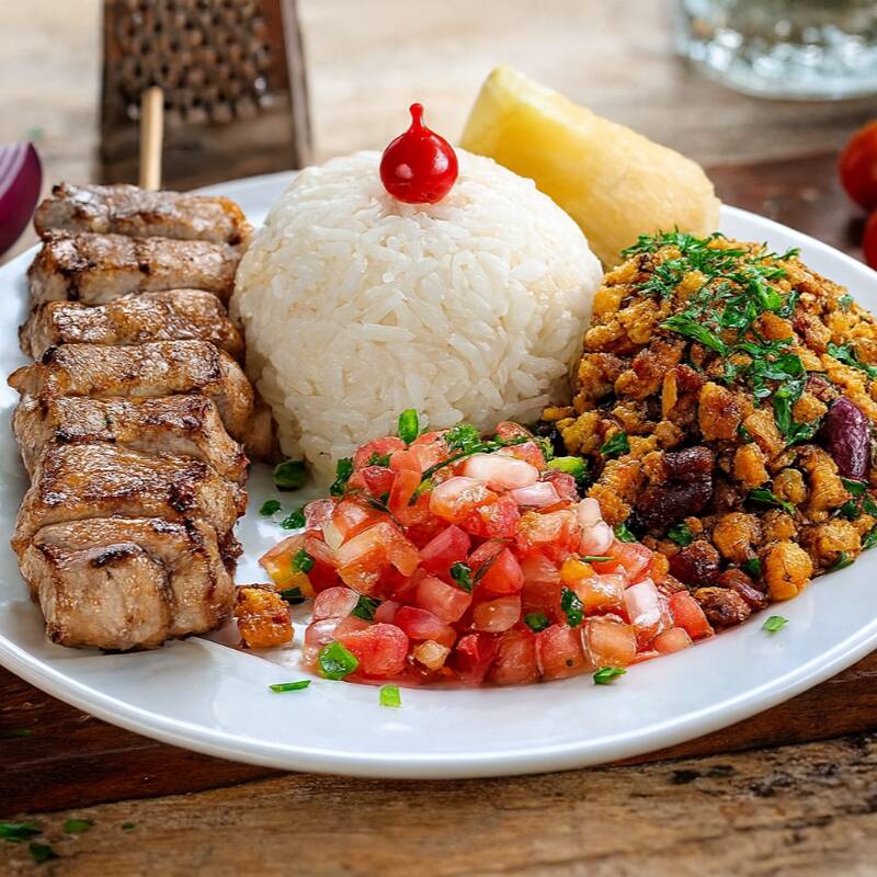 Espetinho de picanha montada servido com arroz branco soltinho, feijão tropeiro, mandioca cozida na manteiga e vinagrete de tomates frescos.