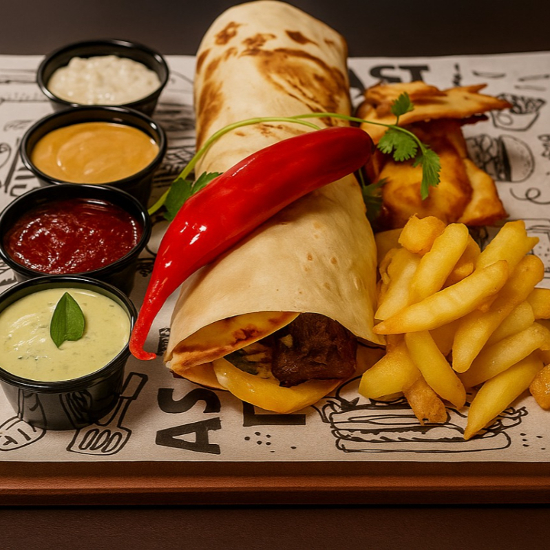 Pão sírio macio, saladinha de repolho com cenoura, pasta de alho árabe cremosa e o espeto da sua escolha, com 3 molhos especiais.