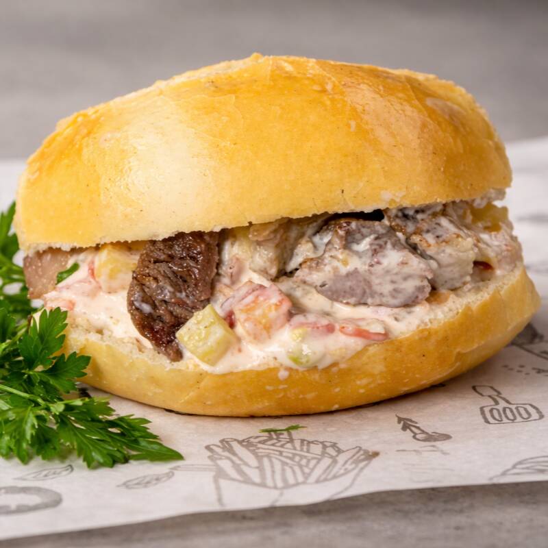 Pão francês crocante, recheado com espeto à sua escolha, suculento e bem temperado, finalizado com molho rosé cremoso ou pasta de alho.