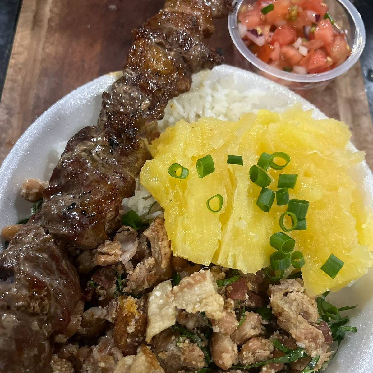 Jantinha completa com arroz, feijão tropeiro, mandioca, vinagrete e espetinho a sua escolha.