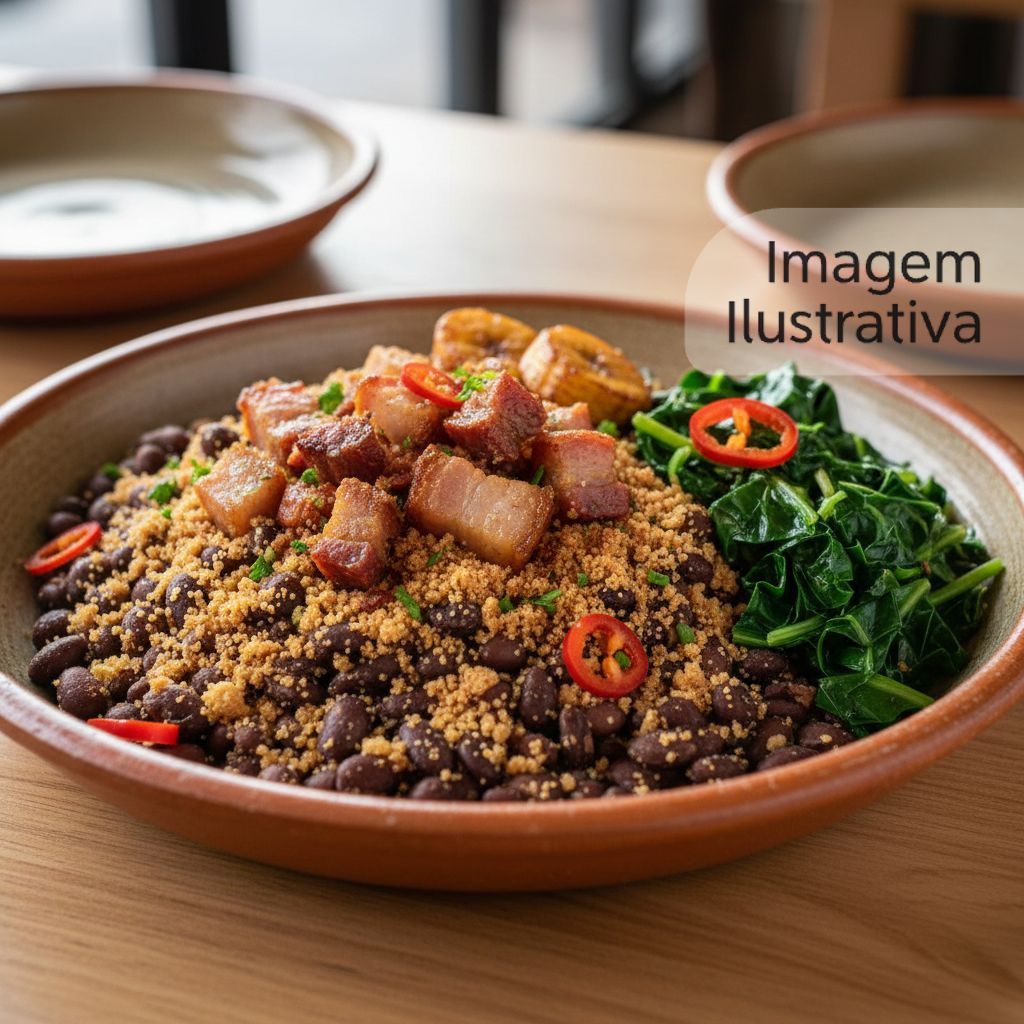 Feijão tropeiro tradicional enriquecido com bacon e couve refogada.