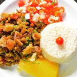 Arroz, feijão tropeiro, mandioca , vinagrete