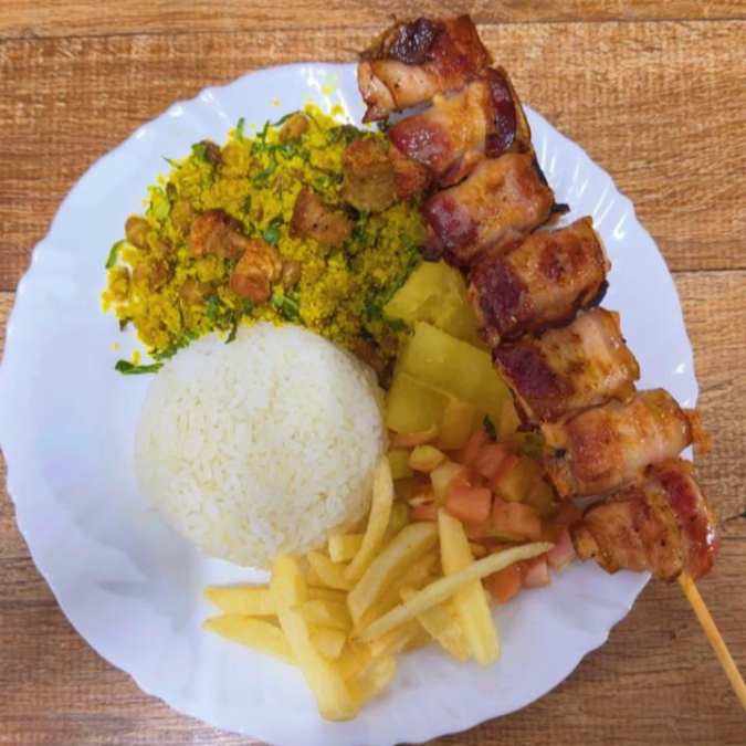 Espeto (escolha), arroz, feijão tropeiro, mandioca e batata frita.