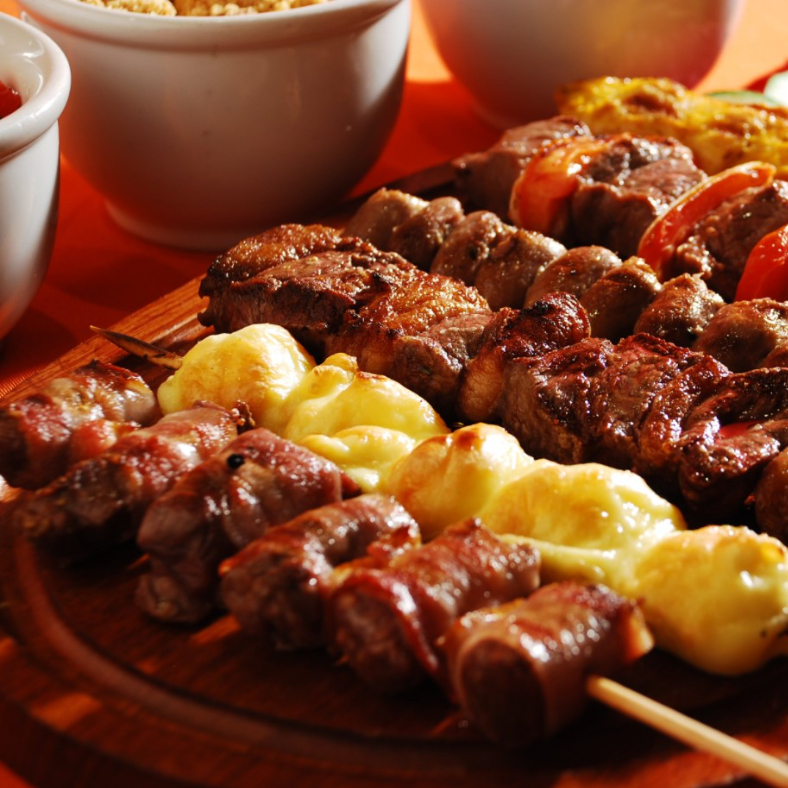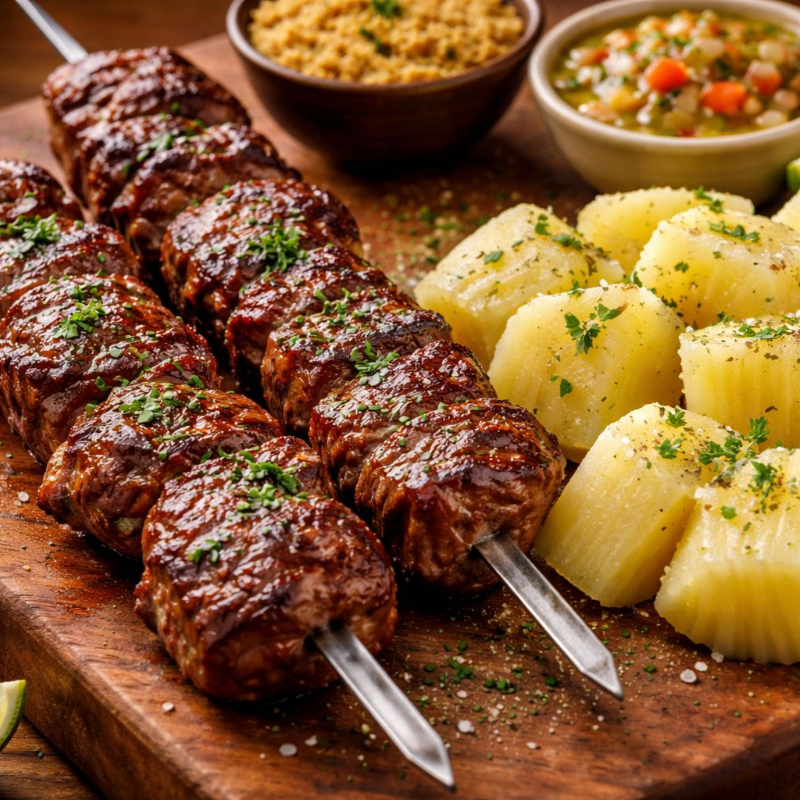Arroz, feijão tropeiro, vinagrete, mandioca + 2 espeto + 1 guaraná 2lts