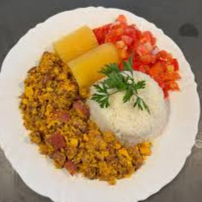 Arroz , feijão tropeiro , vinagrete e mandioca