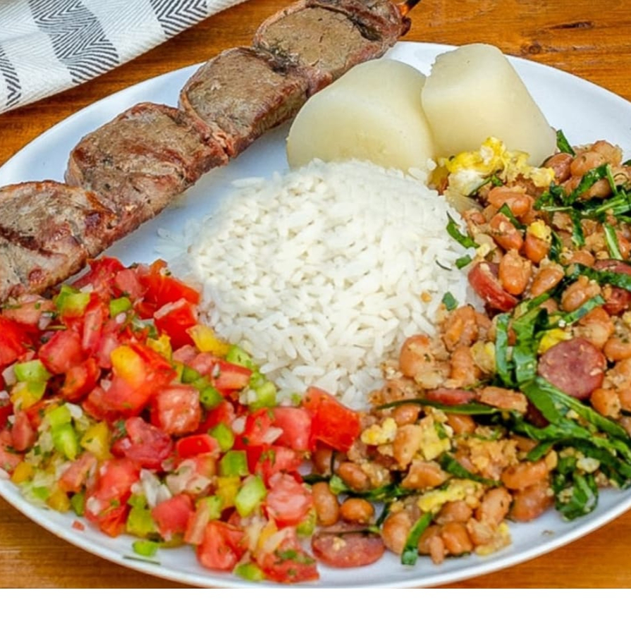 Arroz, feijão tropeiro, vinagrete, mandioca. espeto e refrigerante