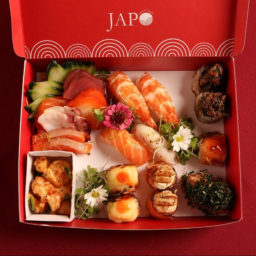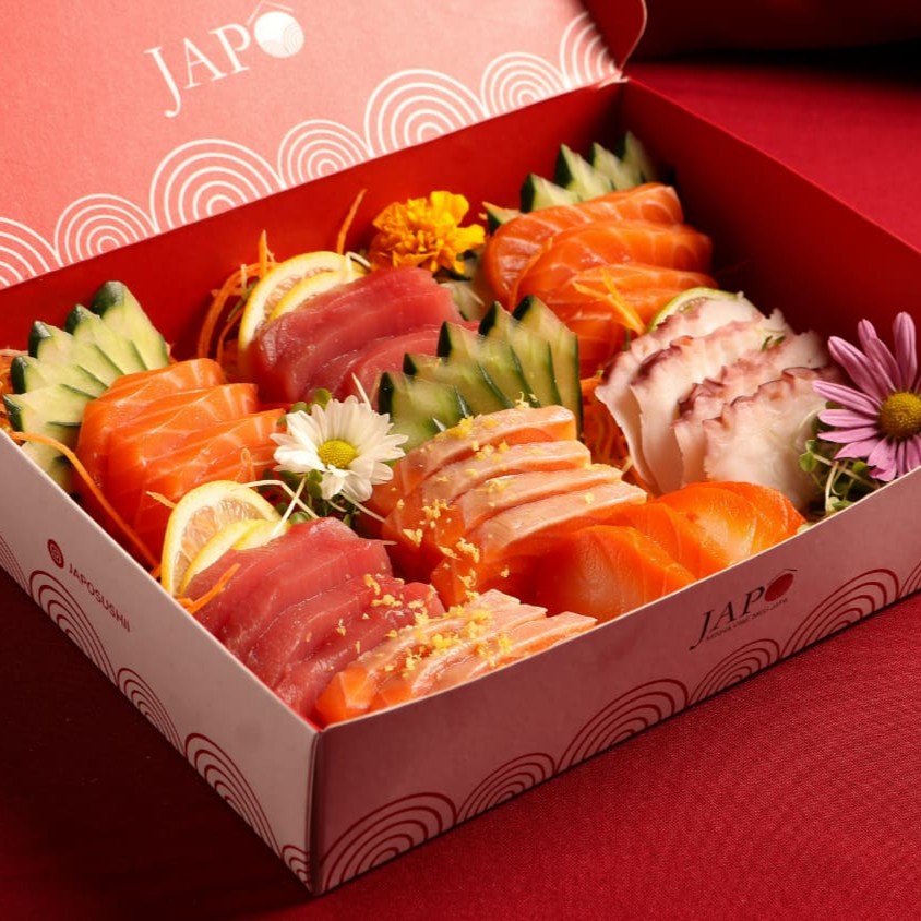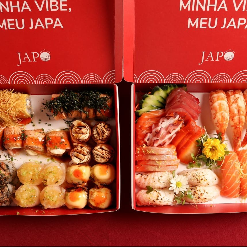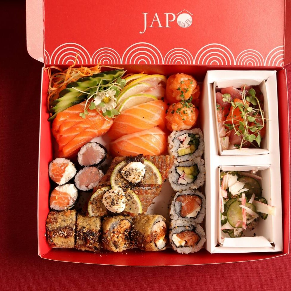 18 Sashimis (4 salmão, 4 atum, 4 barriga trufada, 3 haddock, 3 polvo); 12 Niguiris (4 camarão, 4 barriga de salmão, 4 peixe branco trufado); 12 Jyos (4 Gunkan Brie Salmão e Mel, 4 Salmão com Amêndoa, 4 Gunkan Tropical); 12 Uramakis (4 Skin Double, 4 Amazon, 4 Alascan); 6 Especiais (4 Lounge, 2 Pipoca de Camarão)