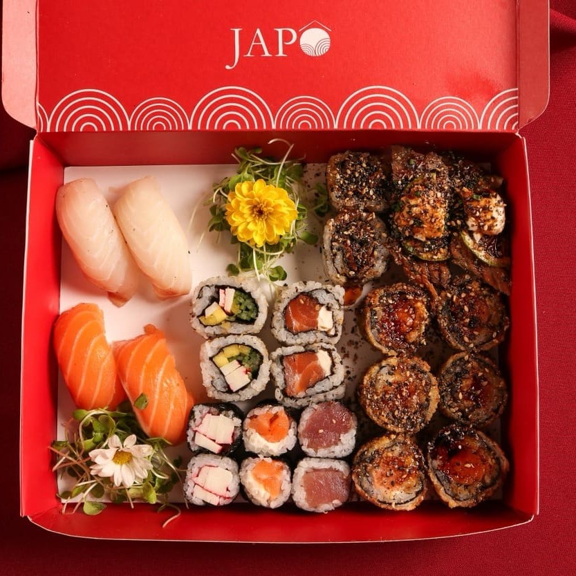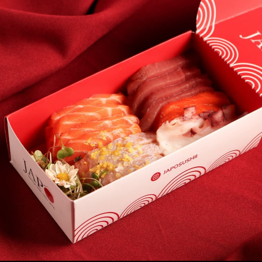 8 Sashimis (4 salmão, 2 peixe branco, 2 atum); 4 Niguiris (2 salmão, 2 peixe branco); 6 Hossomakis (2 Filadélfia, 2 Tekamaki, 2 Kanimaki); 6 Uramakis (2 Filadélfia, 2 California, 2 Skin); 4 Hot Rolls (Filadélfia); 4 Jyos (2 salmão com patê, 2 shimeji & abacaxi)