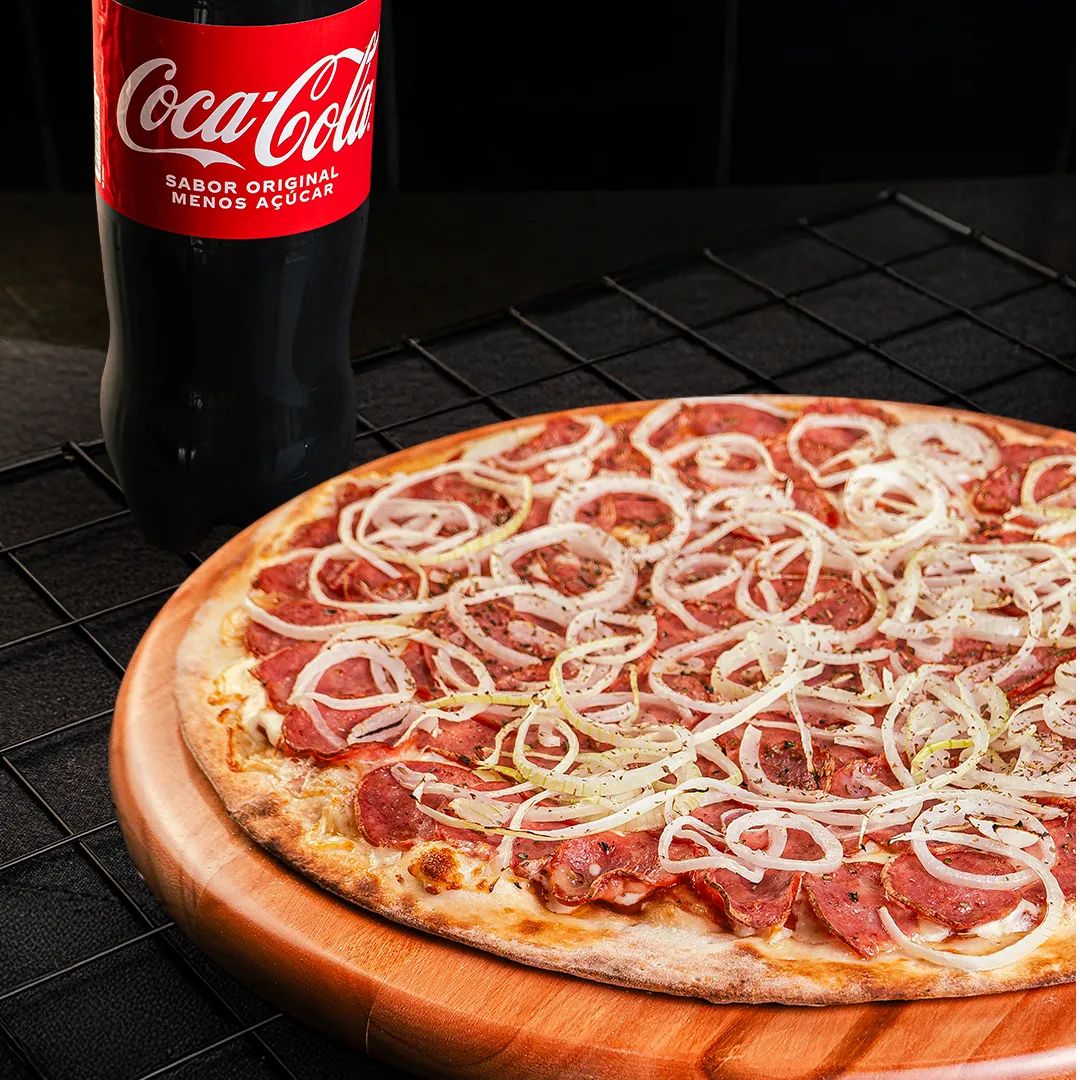 01 Pizza de Calabresa (mussarela, calabresa fatiada e orégano) 01 Pizza de Morango (chocolate e morangos frescos) Acompanha 01 Coca-Cola 2 Litros.