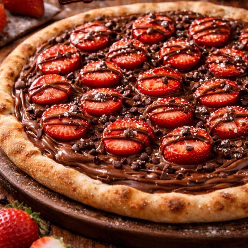 Base de mussarela delicadamente derretida, creme de leite aveludado, chocolate nobre e morangos frescos selecionados, finalizada sobre massa artesanal dourada.