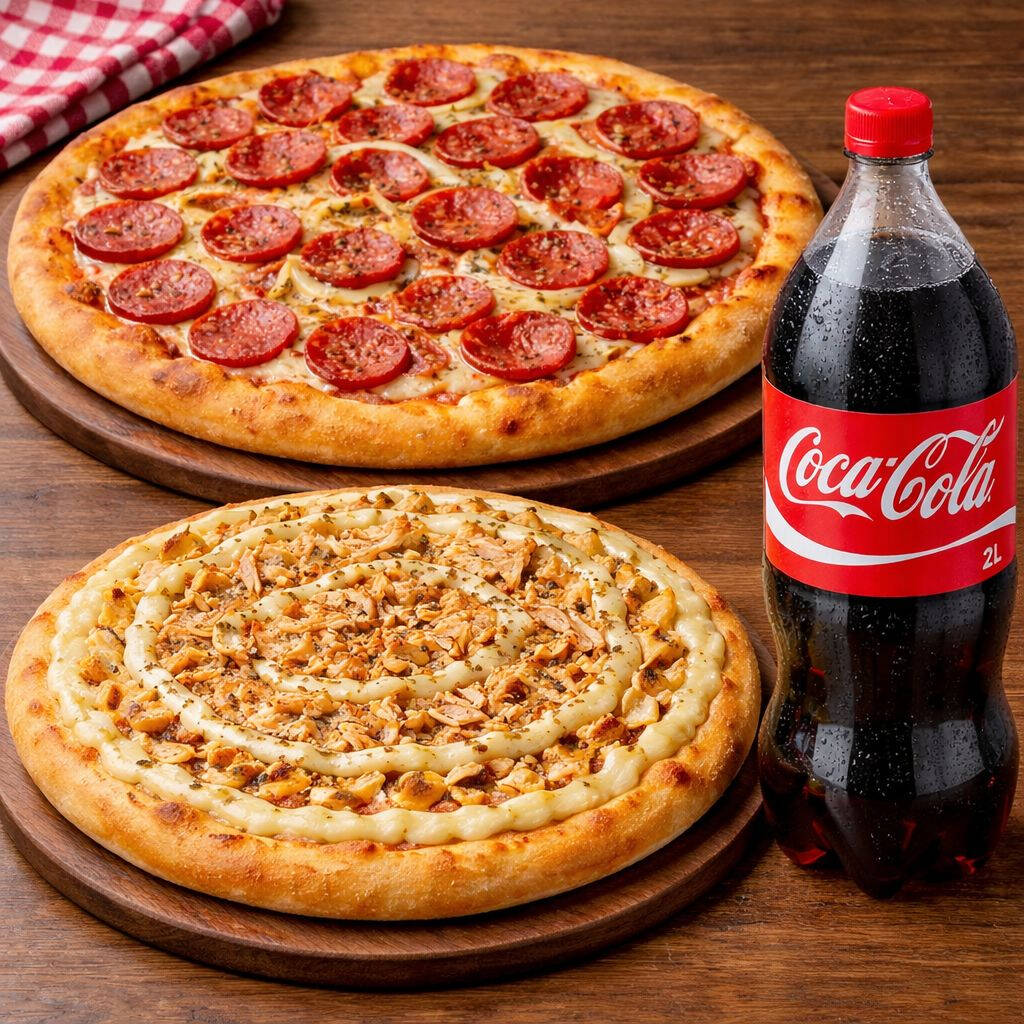 01 Pizza de Calabresa + 01 Pizza de Frango com Catupiry Acompanha Coca-Cola 2 Litros. Ideal pra dividir com a família ou amigos.