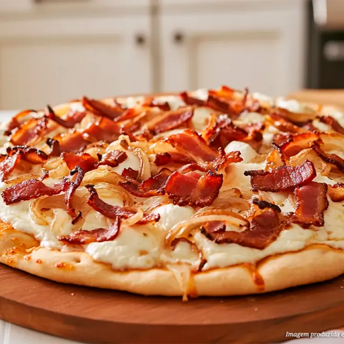 Mussarela selecionada, bacon crocante de alta qualidade, tomate picado fresco e um toque especial de orégano, sobre massa artesanal assada na hora.