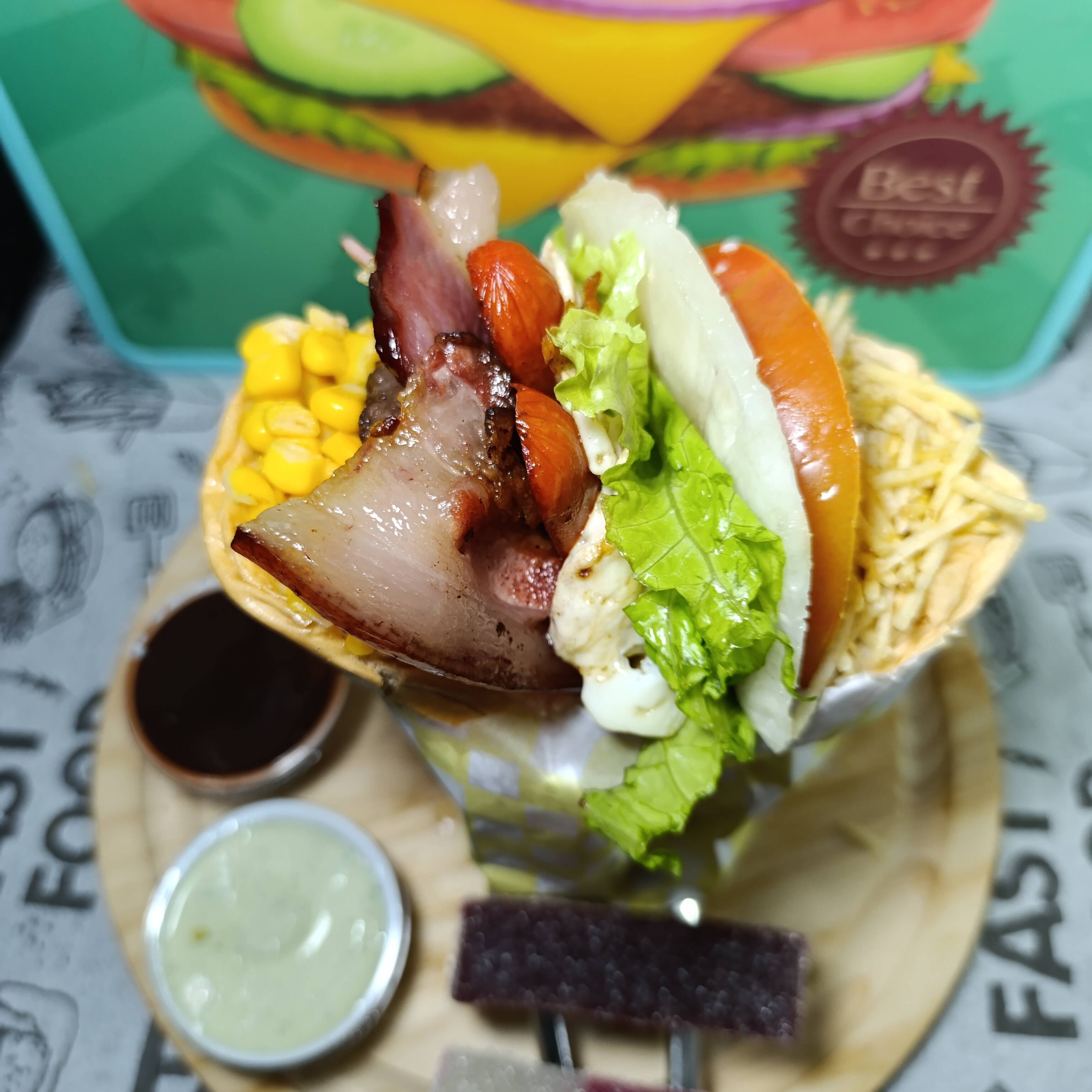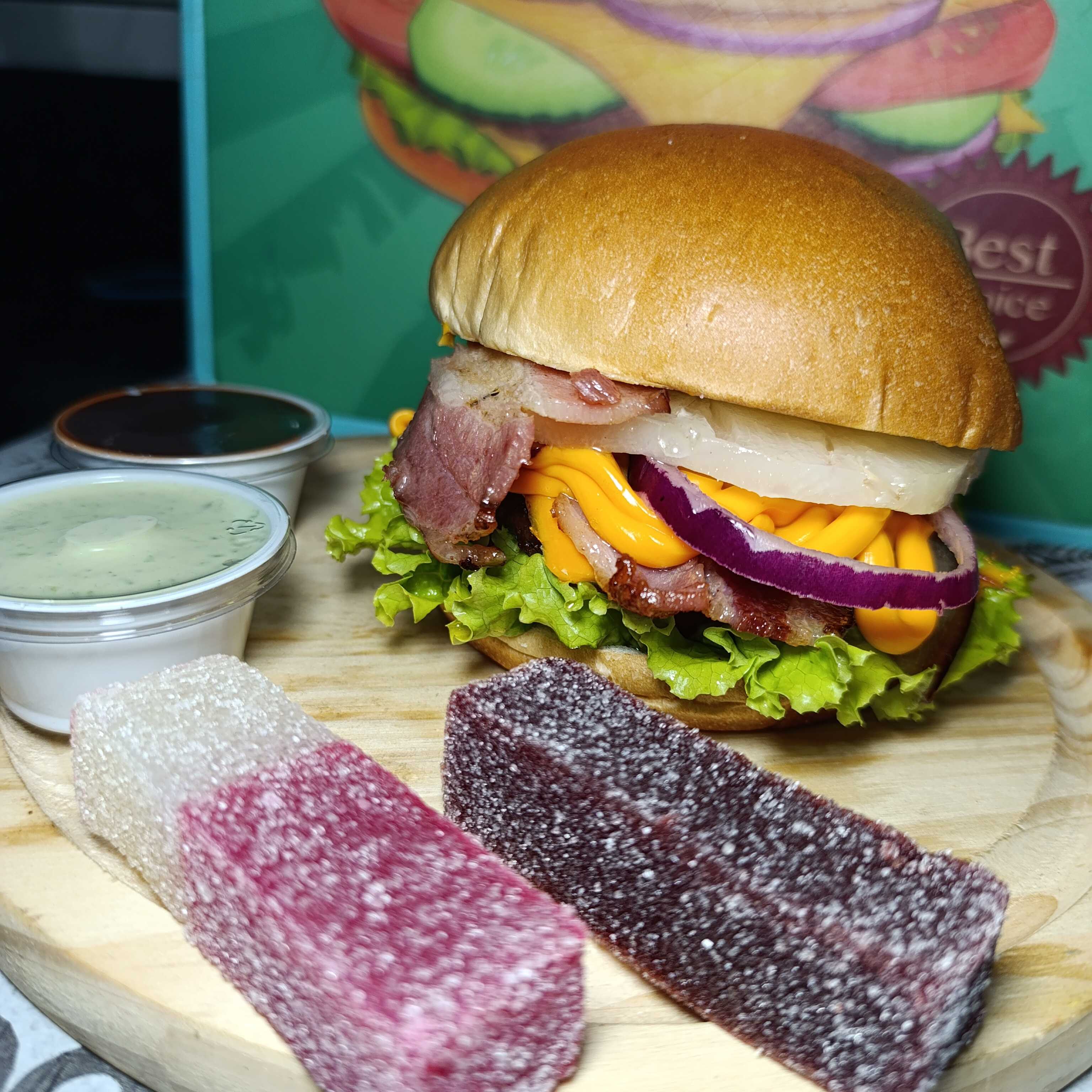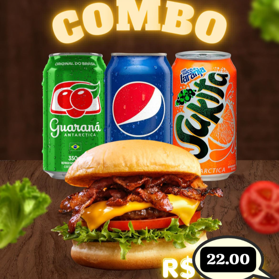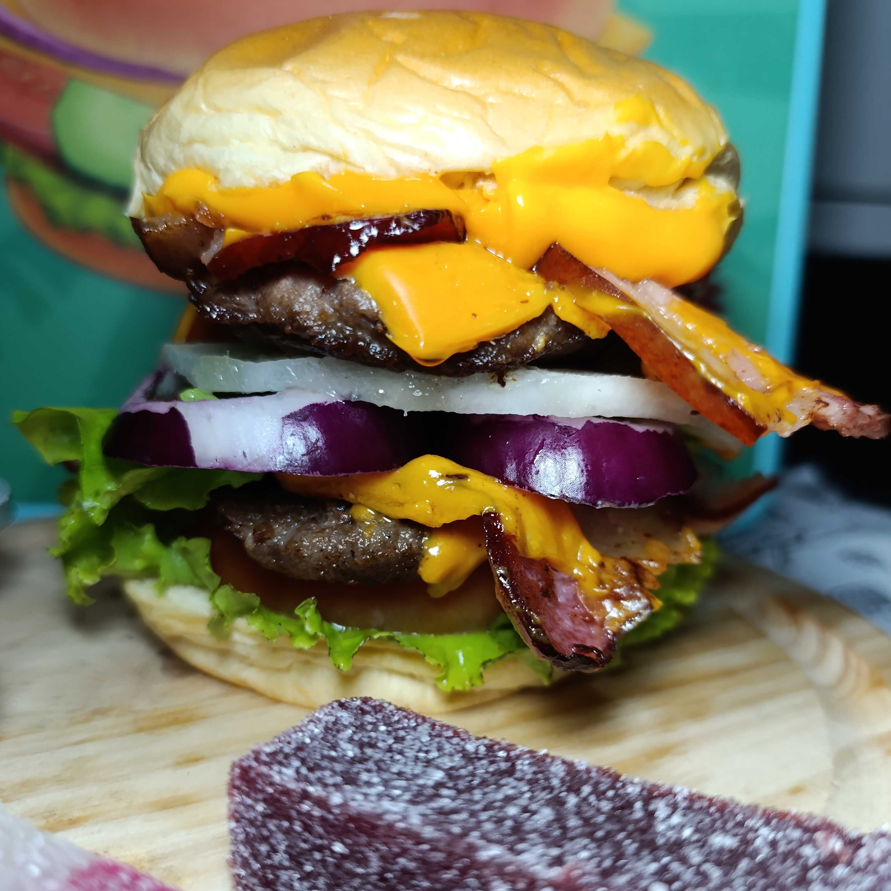 2 hambúrguer de 100 gramas 2 porção de bacon 2 fatia de cheddar alface e tomate