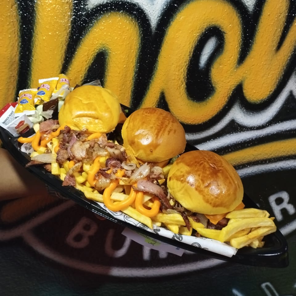 3 lanches 3 pão brioche hambúrguer bacon cheddar alface tomate cebola + 200 gramas de batata com cheddar e bacon