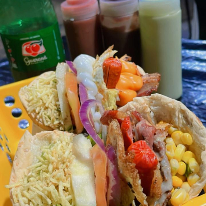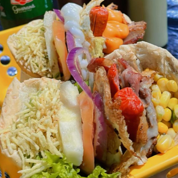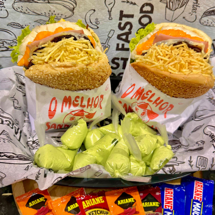 Pão hambúrguer mussarela presunto bacon salsicha alface tomate milho batata palha