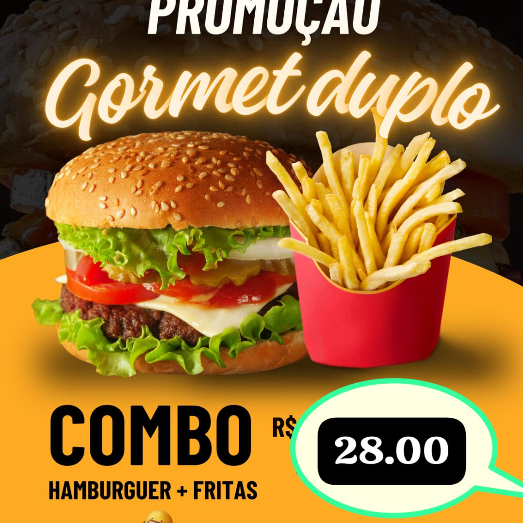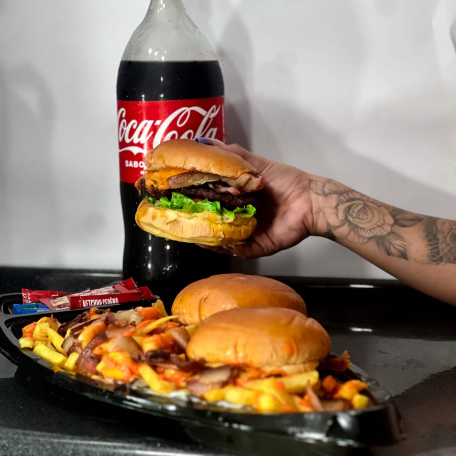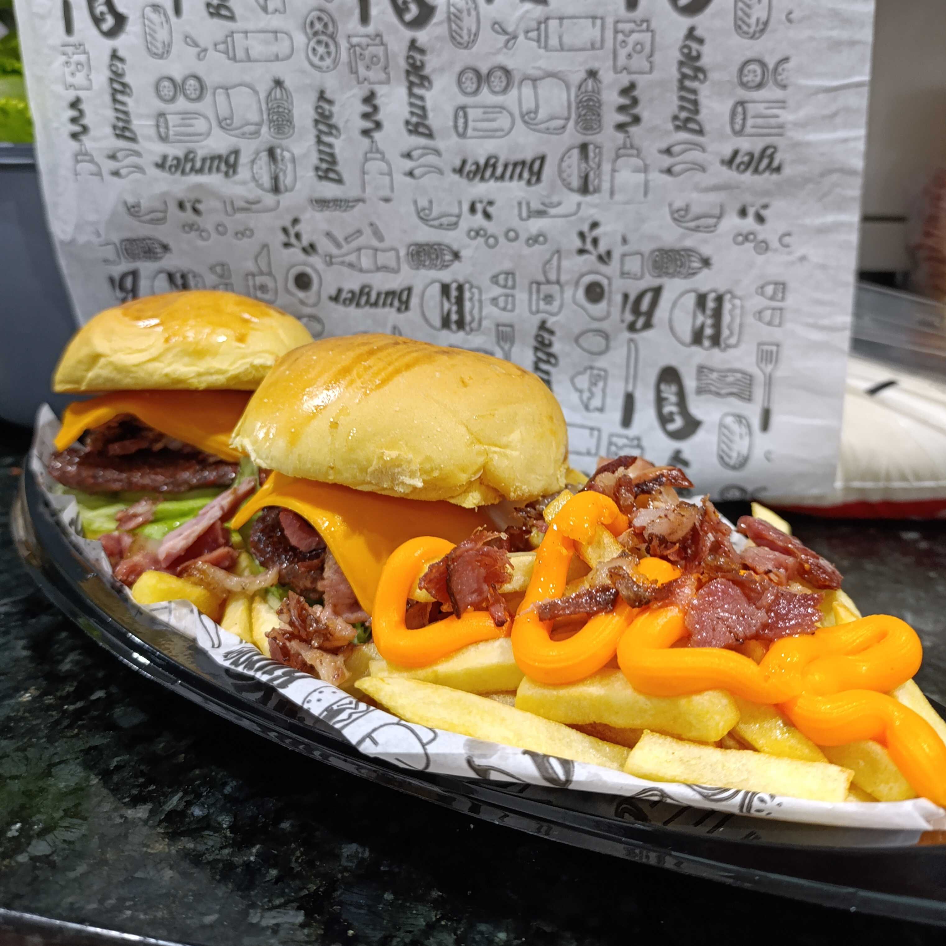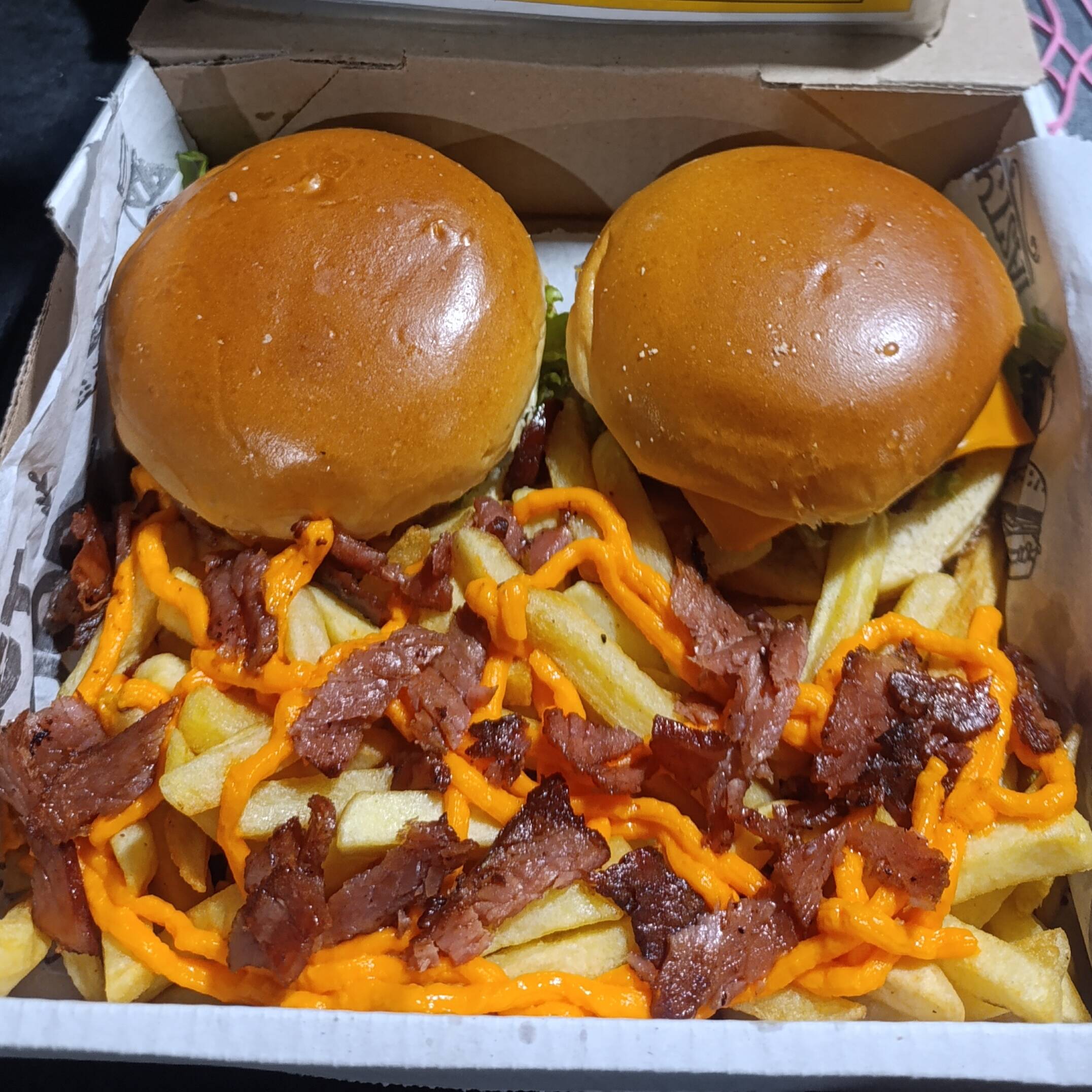 São 2 lanches pão brioche hambúrguer de 120 gramas bacon cheddar barra alface tomate cebola 300 gramas de batata frita com cheddar bisnaga bacon