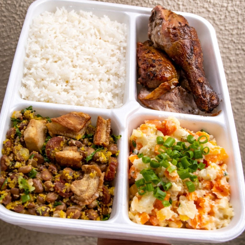 Nossa marmitex caprichada vem com frango assado na brasa, suculento e bem temperado, acompanhado de arroz soltinho, feijão tropeiro saboroso e nossa famosa maionese caseira. Tudo separadinho e sem bagunça Uma refeição completa, feita com carinho e sabor de comida de verdade!