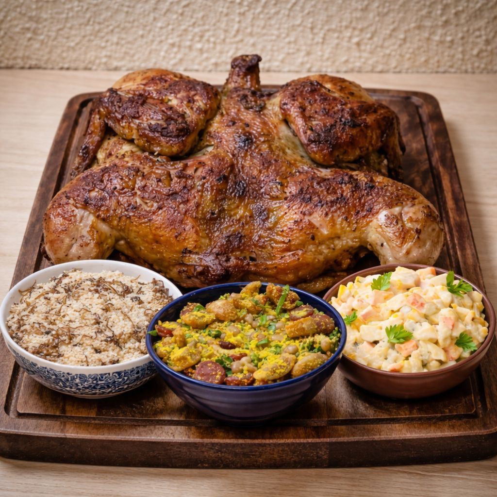 Combo Reforçado pra Família! Aquele frango assado grande, suculento e bem temperado, assado na brasa até ficar douradinho por fora e suculento por dentro E pra acompanhar, um tropeiro G de respeito + Maionese caseira cremosa + farofa de cebola crocante,daquele jeitinho caseiro que dá água na boca! *serve muito bem 4 pessoas*
