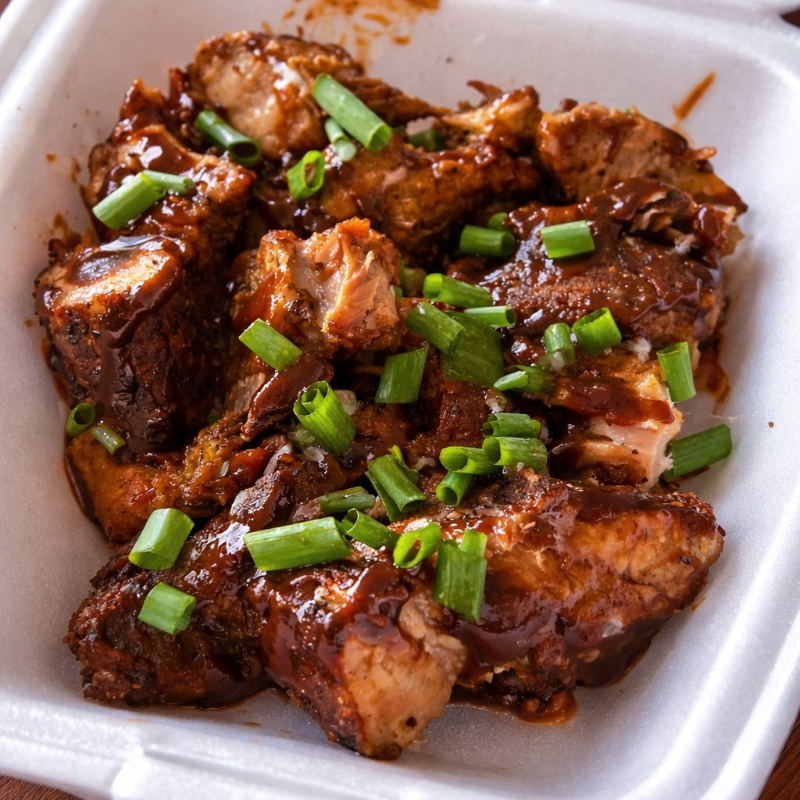 Costelinha suína assada lentamente na brasa, super macia e suculenta, temperada com nosso tempero especial e finalizada com um delicioso molho barbecue, levemente agridoce e defumado. Carne no ponto certo, dourada por fora e macia por dentro, perfeita pra quem gosta de sabor marcante e aquele gostinho de churrasco de verdade •IMAGEM REAL•