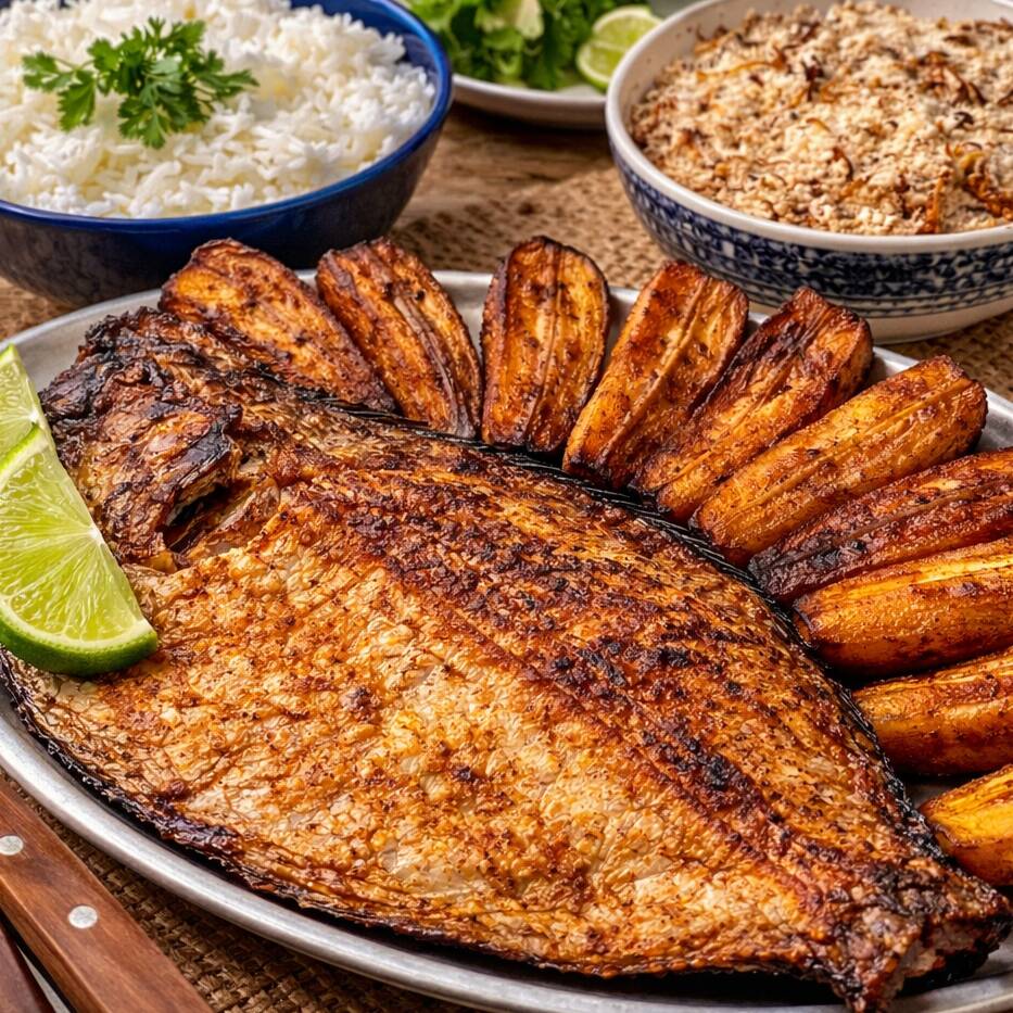 Deliciosa banda de peixe sem espinhos, assada na brasa com tempero especial da casa, suculenta por dentro e levemente dourada por fora Acompanha: Arroz branco (porção grande) Banana frita crocante ,Prato bem servido,