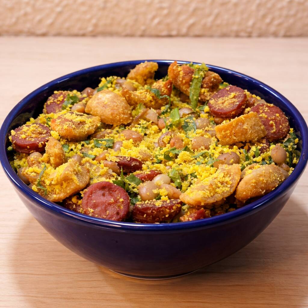 feijão tropeiro à moda goiana: combinação equilibrada de feijão temperado, linguiça calabresa, couve fresca, farinha crocante e torresmo douradinho. Uma poção generosa de 300G para se apreciar Serve bem até 2 pessoas