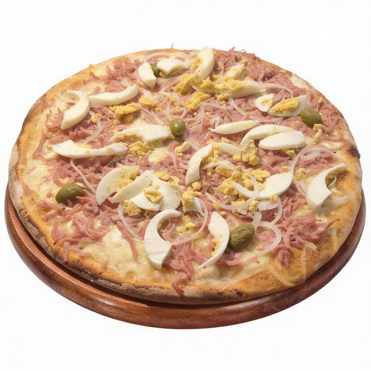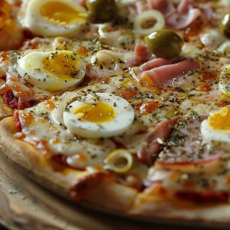 Molho, queijo, presunto,ovos, cebola, azeitonas e orégano.