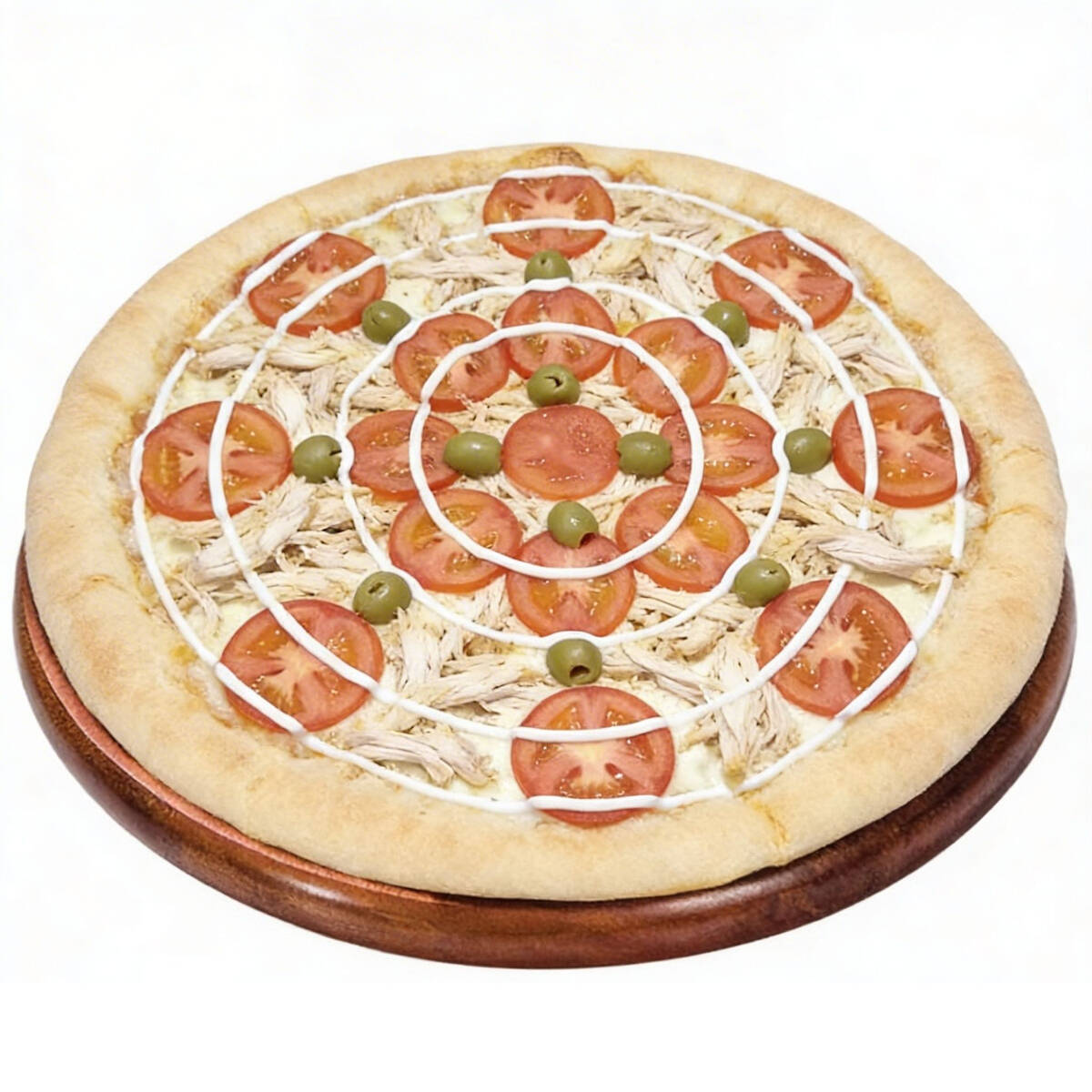Molho, queijo, frango,Catupiry, cebola, tomate, azeitonas e orégano.