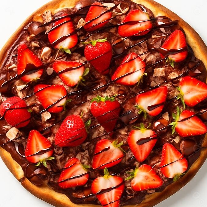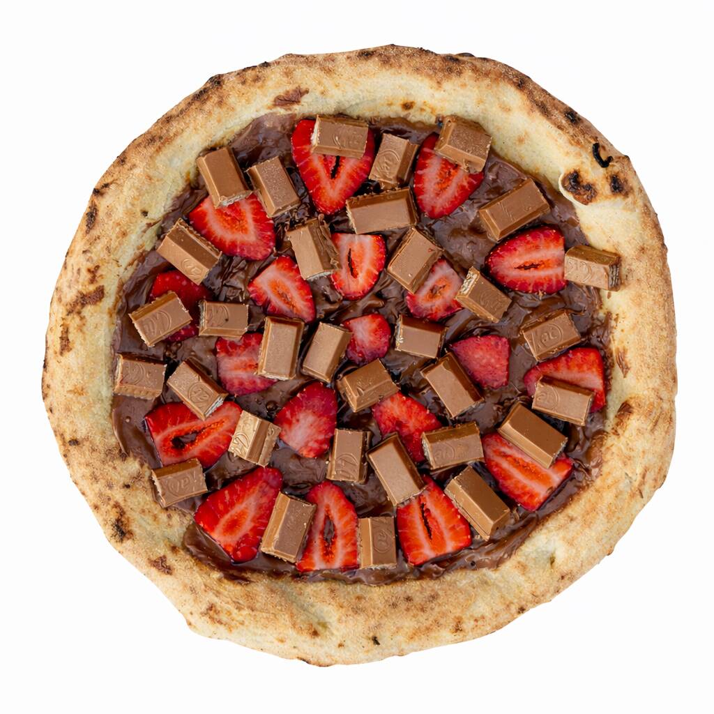 Deliciosa pizza com borda chocolate ao leite Premium, recheios kit Kat e morangos frescos e mais chocolate ao leite