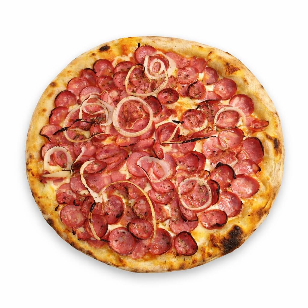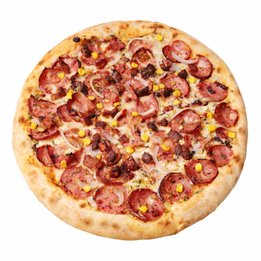 Molho artesanal, mussarela bem derretida , calabresa , bacon crocante, milho verde, cebola e orégano
