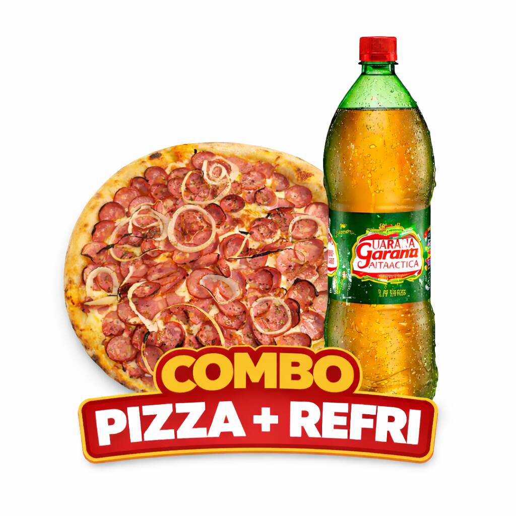 Nosso molhos artesanal, mussarela bem derretida, muita calabresa, cebola e orégano, acompanha um guaraná de 1,5 litro bem gelado