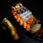 10 Sashimis de Salmão, 5 Niguiris de Salmão, 5 Hot Philadelphia, 10 Uramakis de Salmão e 5 Gunkans com Calda de Maracujá. Um Combo Especial Para os Amantes de Salmão! Acompanha 2 Hashis, 3 Shoyus e 1 Tarê.