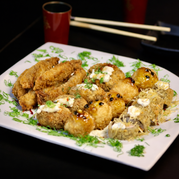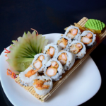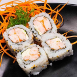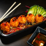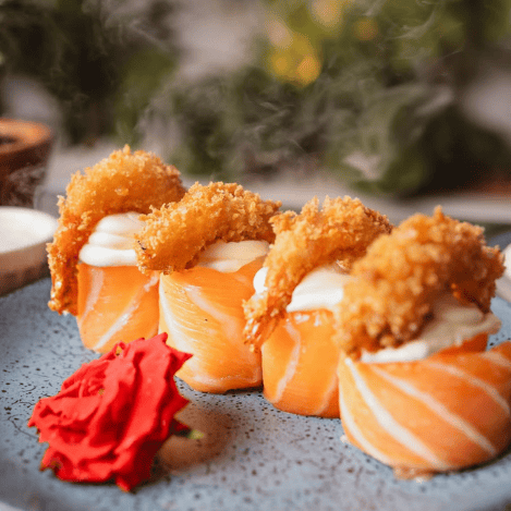 Camarão Empanado com Recheio de Cream Cheese e Salmão, Finalizado com Toque Crocante e Cremoso. Sabor Intenso em Cada Mordida! Acompanha 1 Hashi, 2 Shoyus e 1 Tarê.