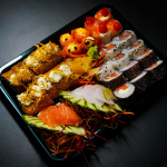 10 Unidades com Camarão Empanado, Envolto em Cream Cheese e Salmão Maçaricado. Explosão de Textura e Sabor! Acompanha 1 Hashi, 2 Shoyus e 1 Tarê.